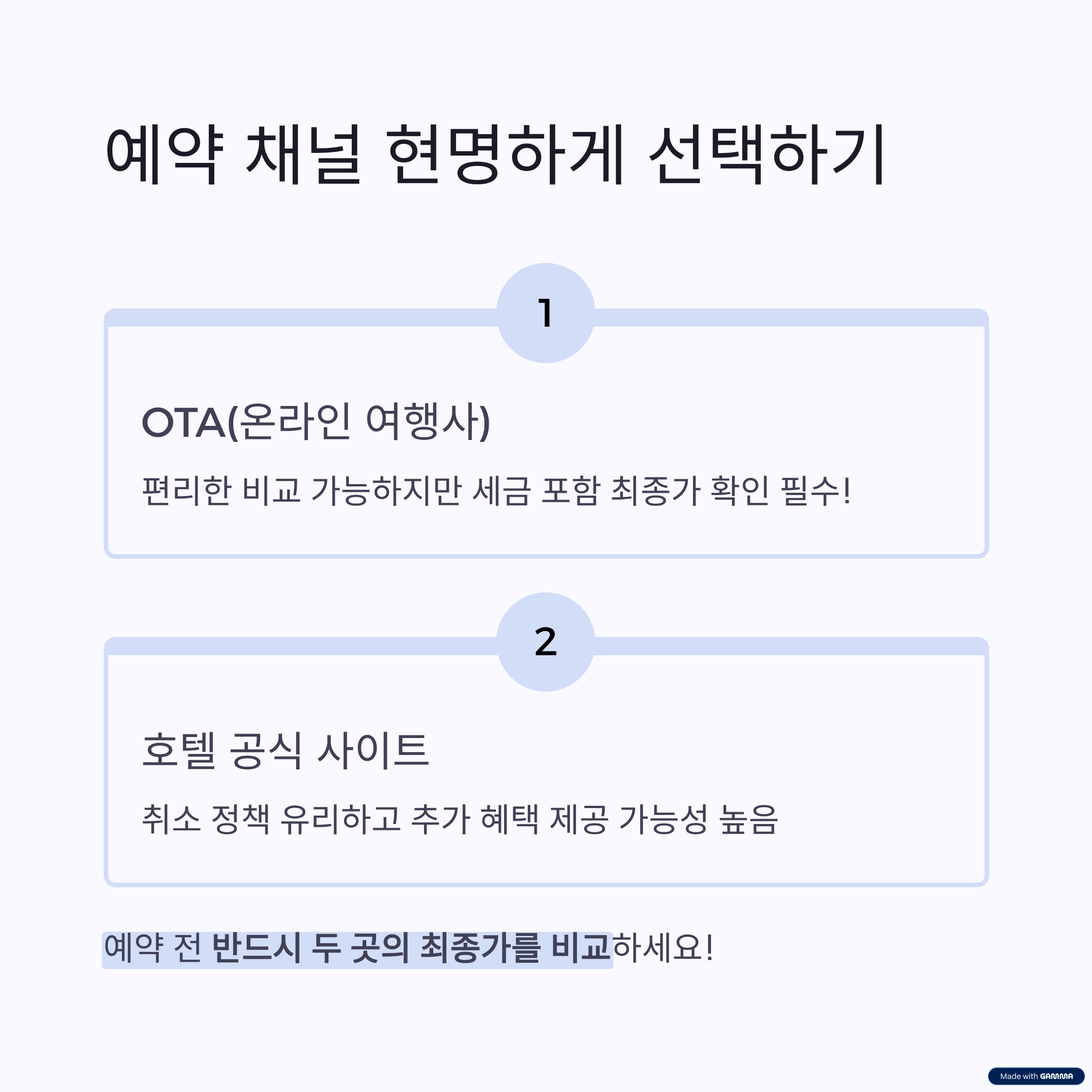 OTA는 할인율이 높지만, 호텔 직접 예약은 무료 업그레이드나 추가 서비스 제공이 강점입니다. 둘 다 비교 후 선택하세요.