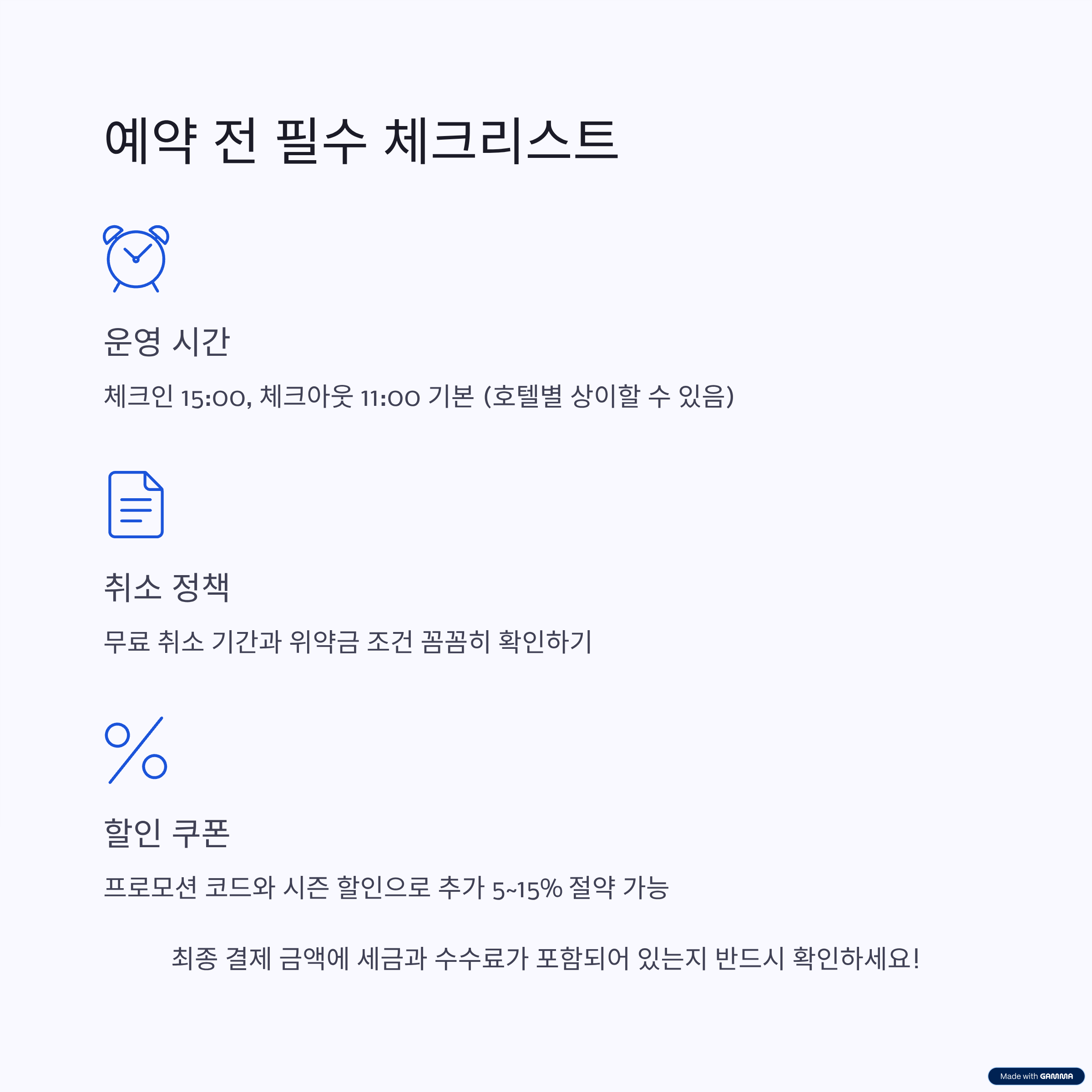 | 성수기 2~3개월 전, 프로모션 시작 시점 | OTA와 공식 사이트 세금 포함가 비교 | 오션뷰는 조기 예약 필수, 평일 숙박 추천 |
