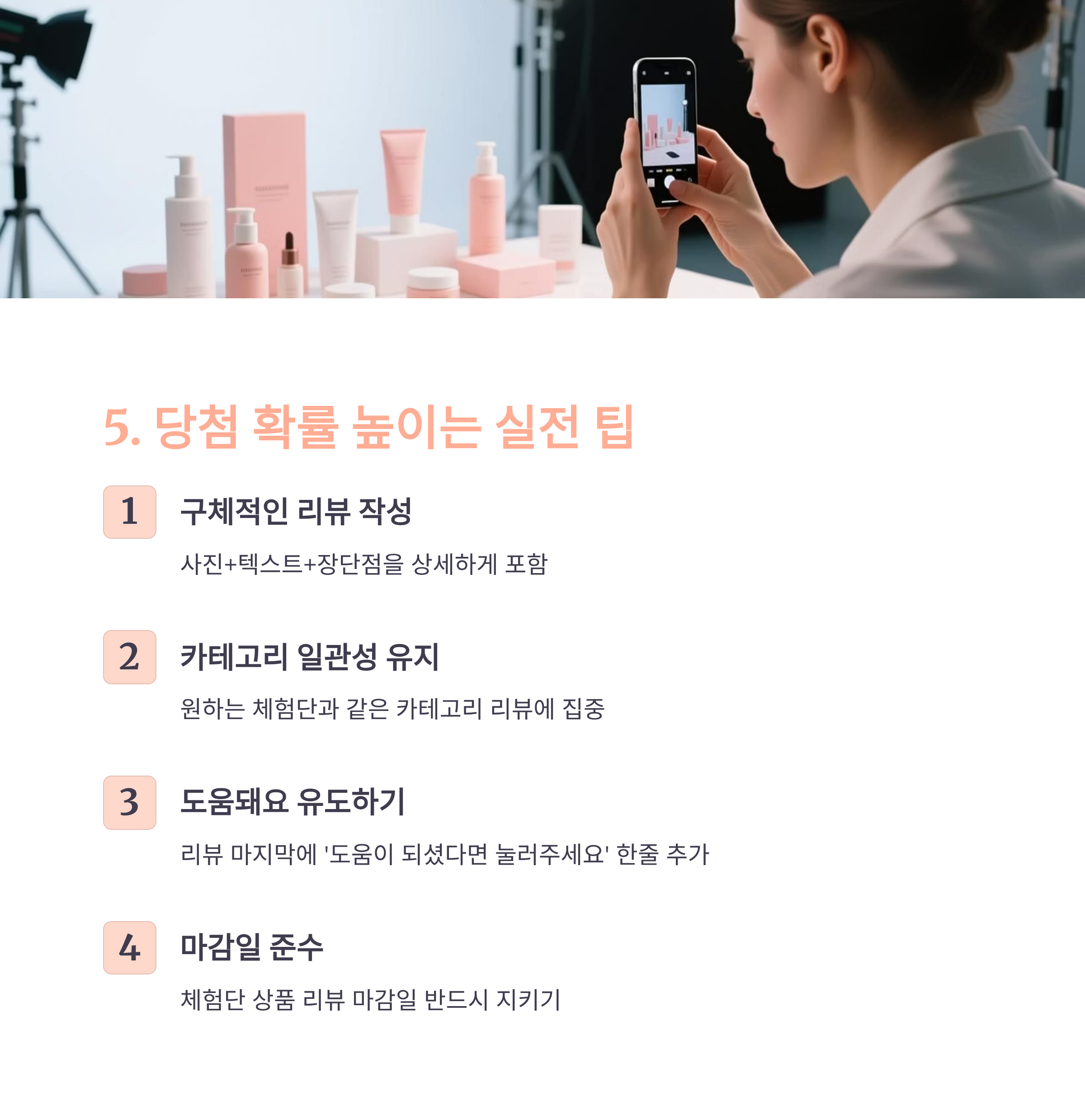 - 특정 카테고리 집중: 예) 주방용품 체험단을 원한다면 최근 리뷰도 주방 관련 제품 위주로 집중