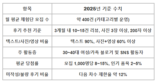 - 외부 경로 지원: 쿠팡 외에 블로그 체험단 365, 위블링, 인스타그램 연동 체험단도 존재