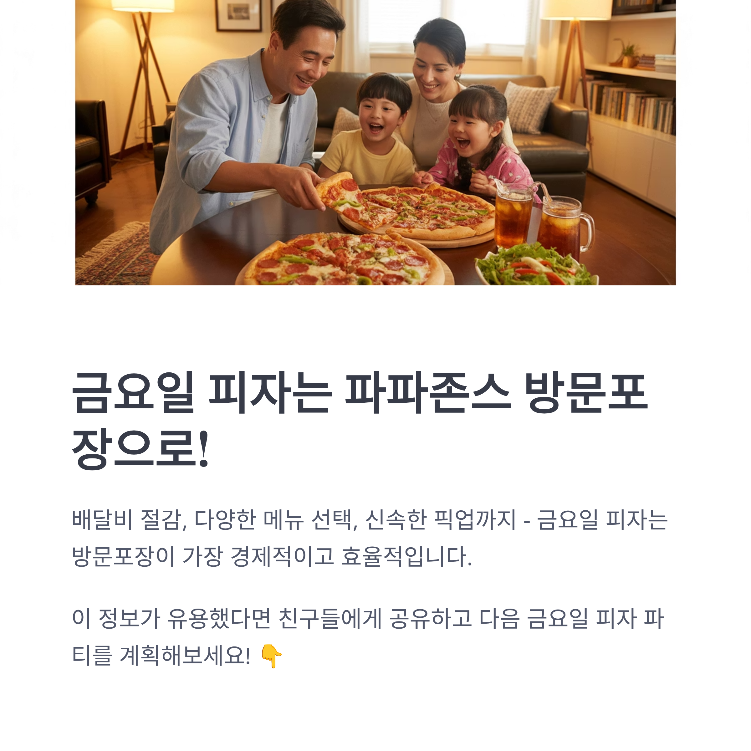 이번 주 금요일, 방문 포장 한 번 해보시죠? 만족도 200% 보장합니다. 🍕