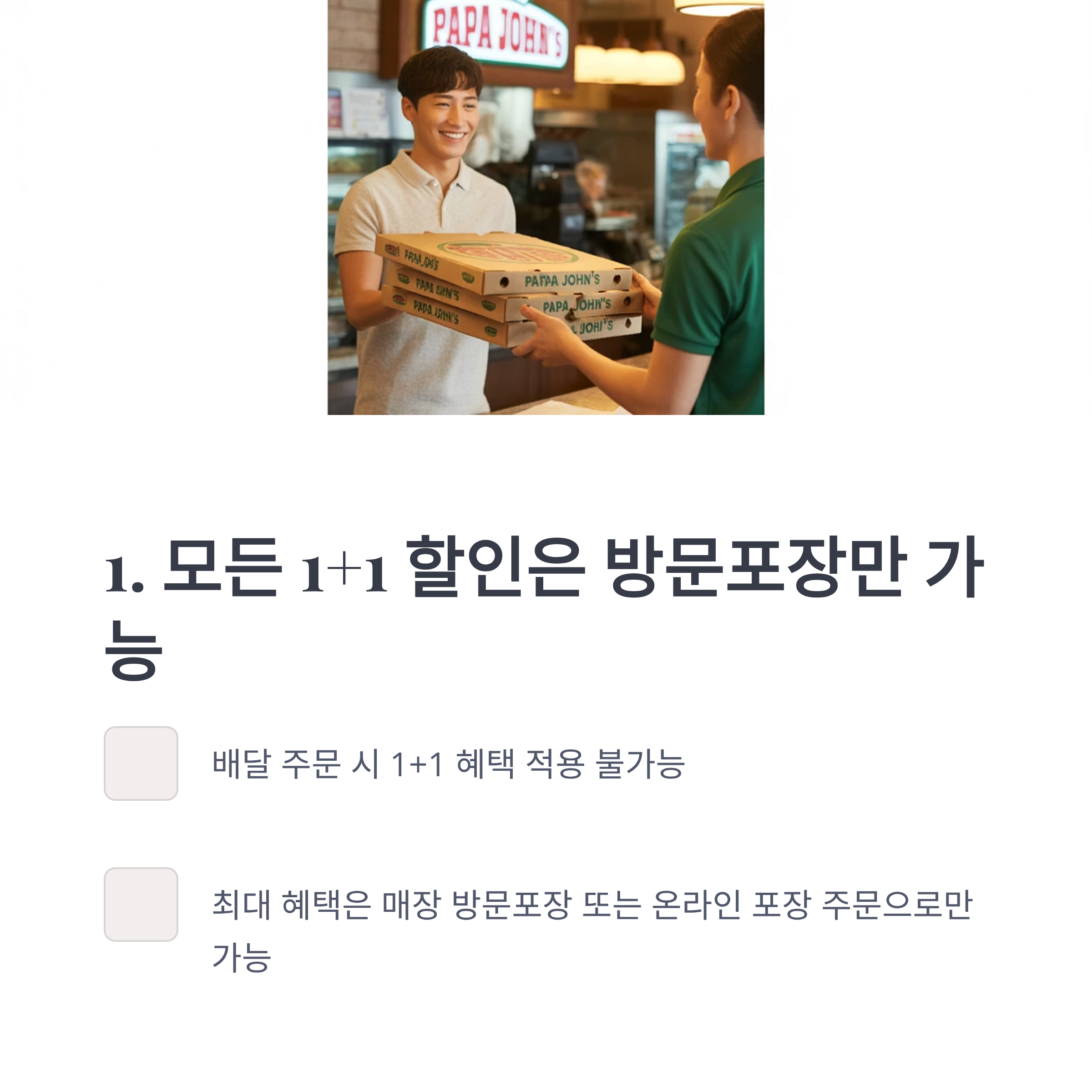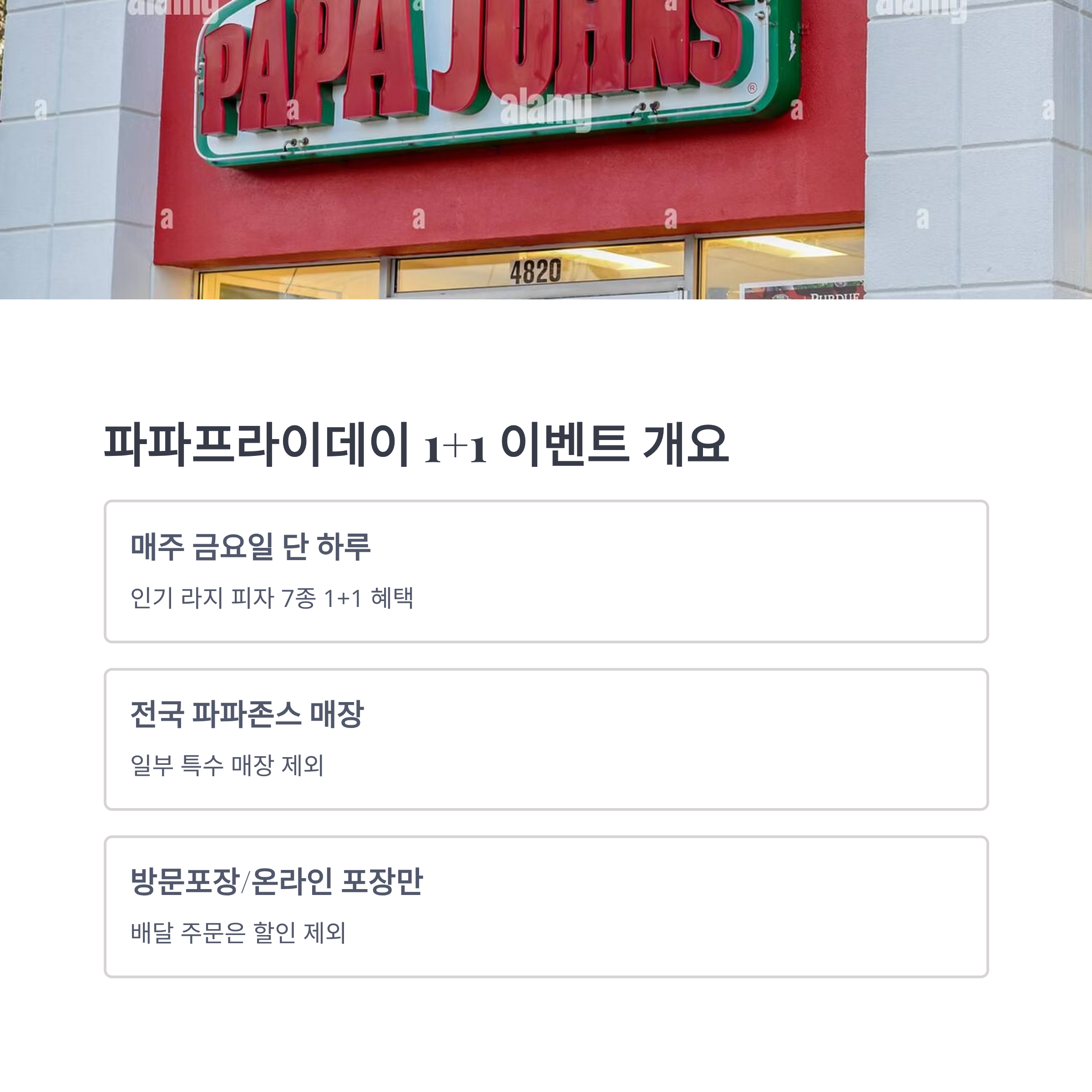 파파프라이데이 1+1 이벤트는 매주 금요일 단 하루, 오직 **방문 포장 또는 온라인 포장 주문**에만 적용됩니다.
