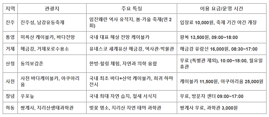 진주, 통영, 거제, 산청, 사천 등 지역별 특색 있는 명소를 잘 조합하면 맞춤형 여행이 가능합니다.