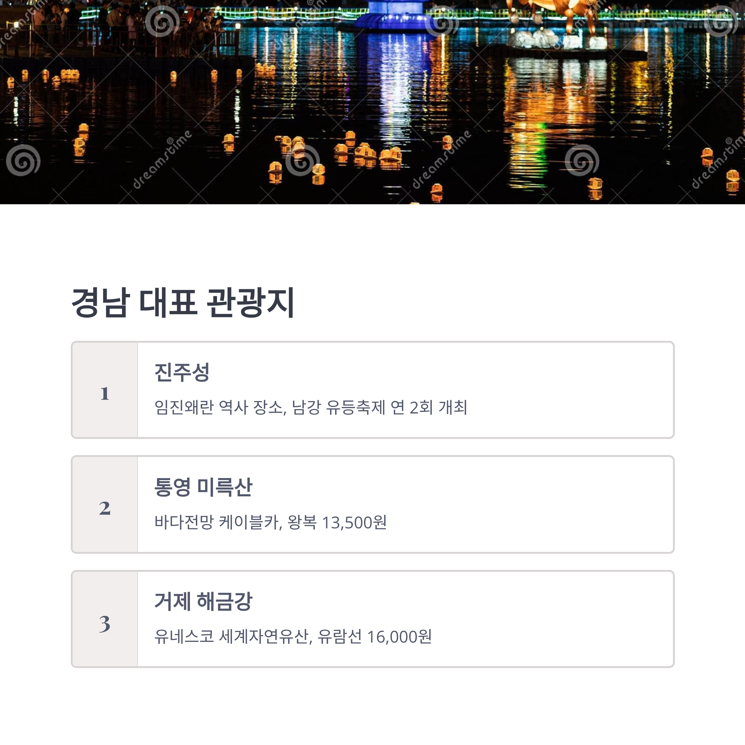 - 🎉 축제·이벤트: 남강유등축제(진주), 통영 봄 바다축제, 거제 조선해양축제 등 활발