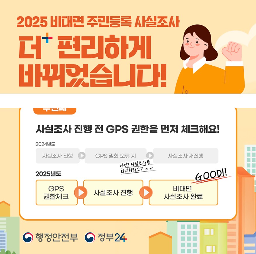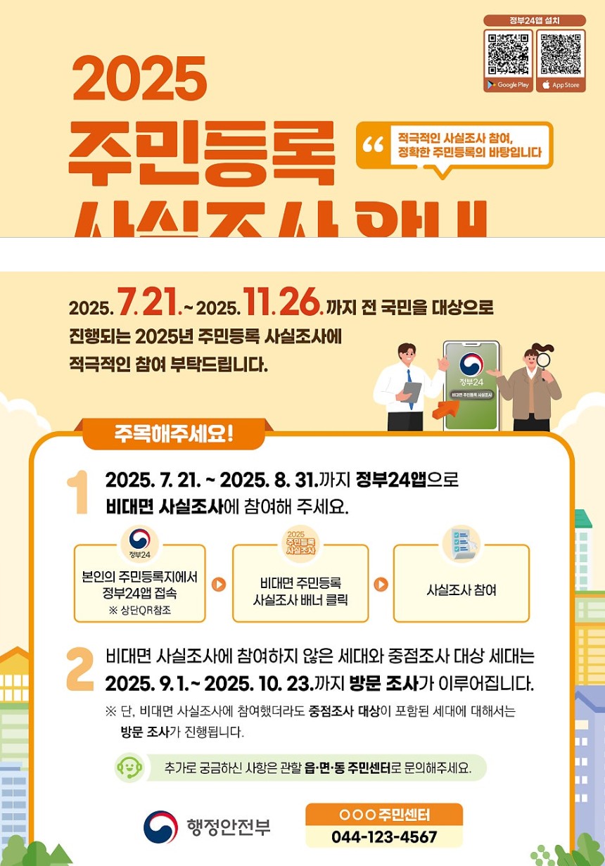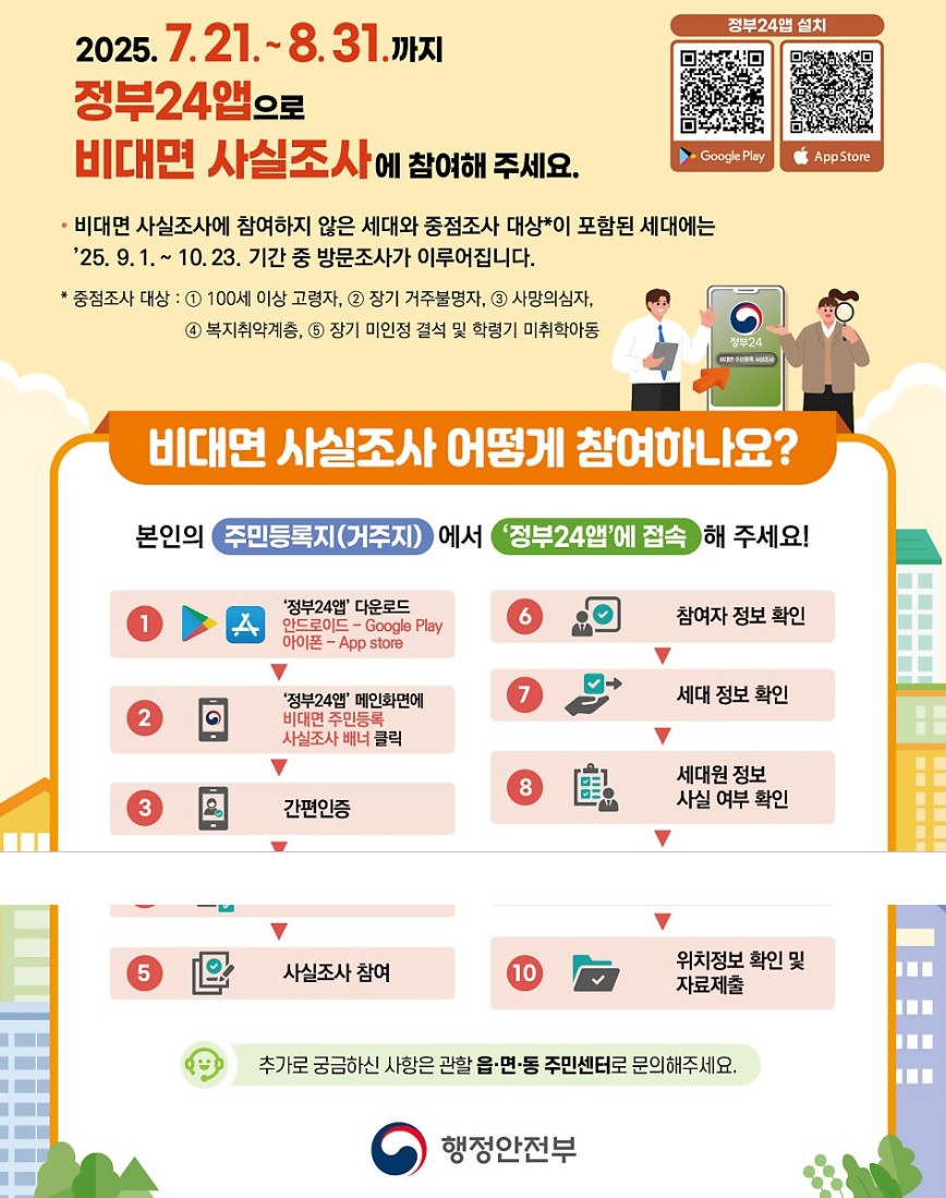 2025년 주민등록 비대면 사실조사 참여 시 반드시 확인해야 할 안내사항을 정리했습니다. 공공조사 참여 시 오류 없이 반영되기 위해서는 아래 사항을 꼭 준수해 주세요.
