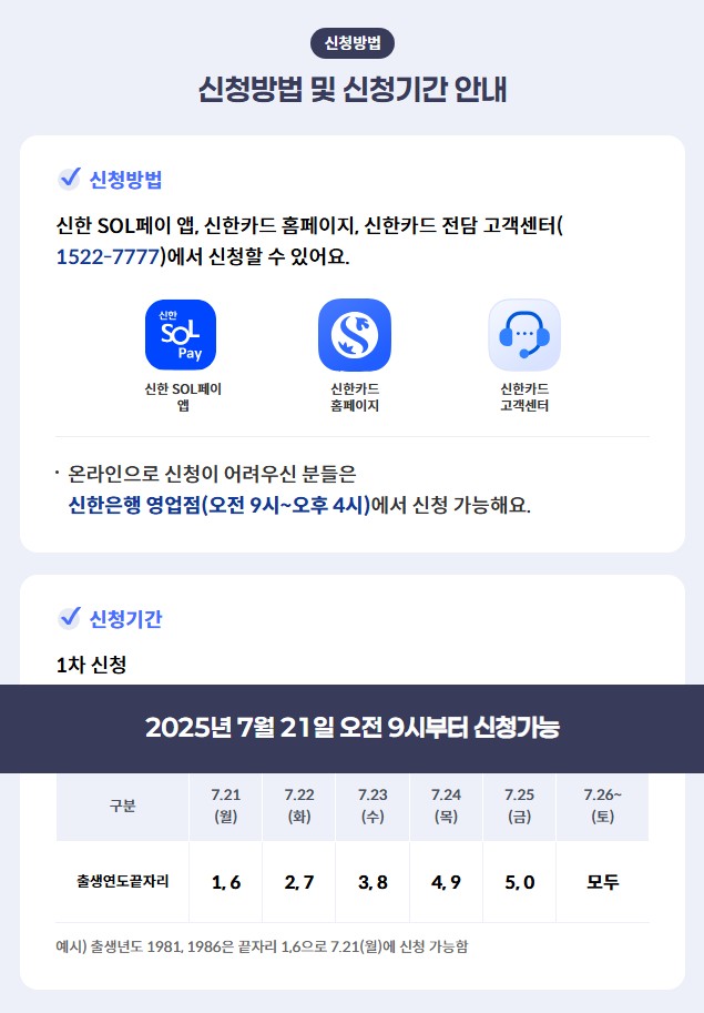 2025년 7월 21일부터 신한카드 국민생활회복 소비쿠폰 신청이 시작됩니다! 경제 회복과 함께 풍성한 혜택을 누릴 수 있는 절호의 기회, 놓치지 마세요. 신청 방법과 기간을 지금 바로 확인하세요!