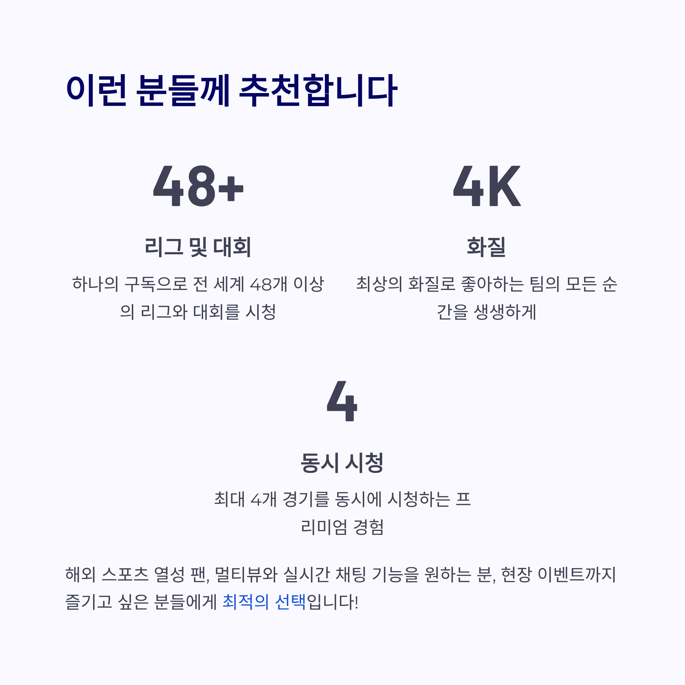 EPL, NBA, F1 등 전 세계 스포츠를 한 번에, 합리적인 가격으로, 초고화질과 다양한 기능과 함께 즐길 수 있습니다.