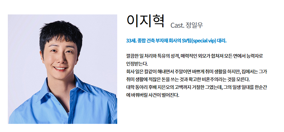 주인공 이지혁(정일우)은 능력 있는 MZ세대 직장인으로, 직장과 가정에서 모두 중심적인 역할을 합니다.