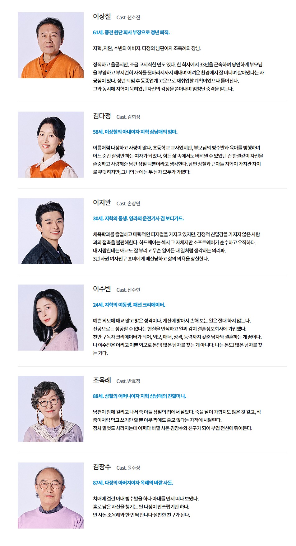 - 이상철: 지혁의 아버지, 정년퇴직 후 재취업을 준비.
